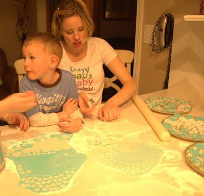 Roll out the fondant into a circle twice the diameter of the cake you are covering. As you roll, lift and move the fondant to prevent it from sticking to the surface. Gently lift fondant over rolling pin and place over cake. ( I didn't get a picture of this because it helps to have 2 people, especially if the cake is large.)